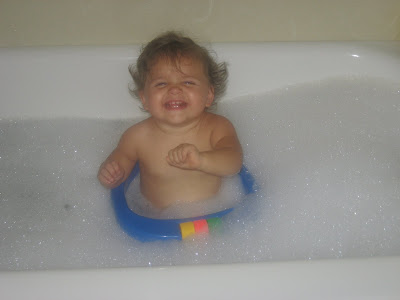 Then last night, Aunt Stefanie, Uncle Jared, and Gracen came over for burgers. Gracen and I liked Daddy's burgers. We also played in the yard. Daddy gave me my bath while Mommy cleaned up. Daddy, this is WAY to many bubbles, hahaha